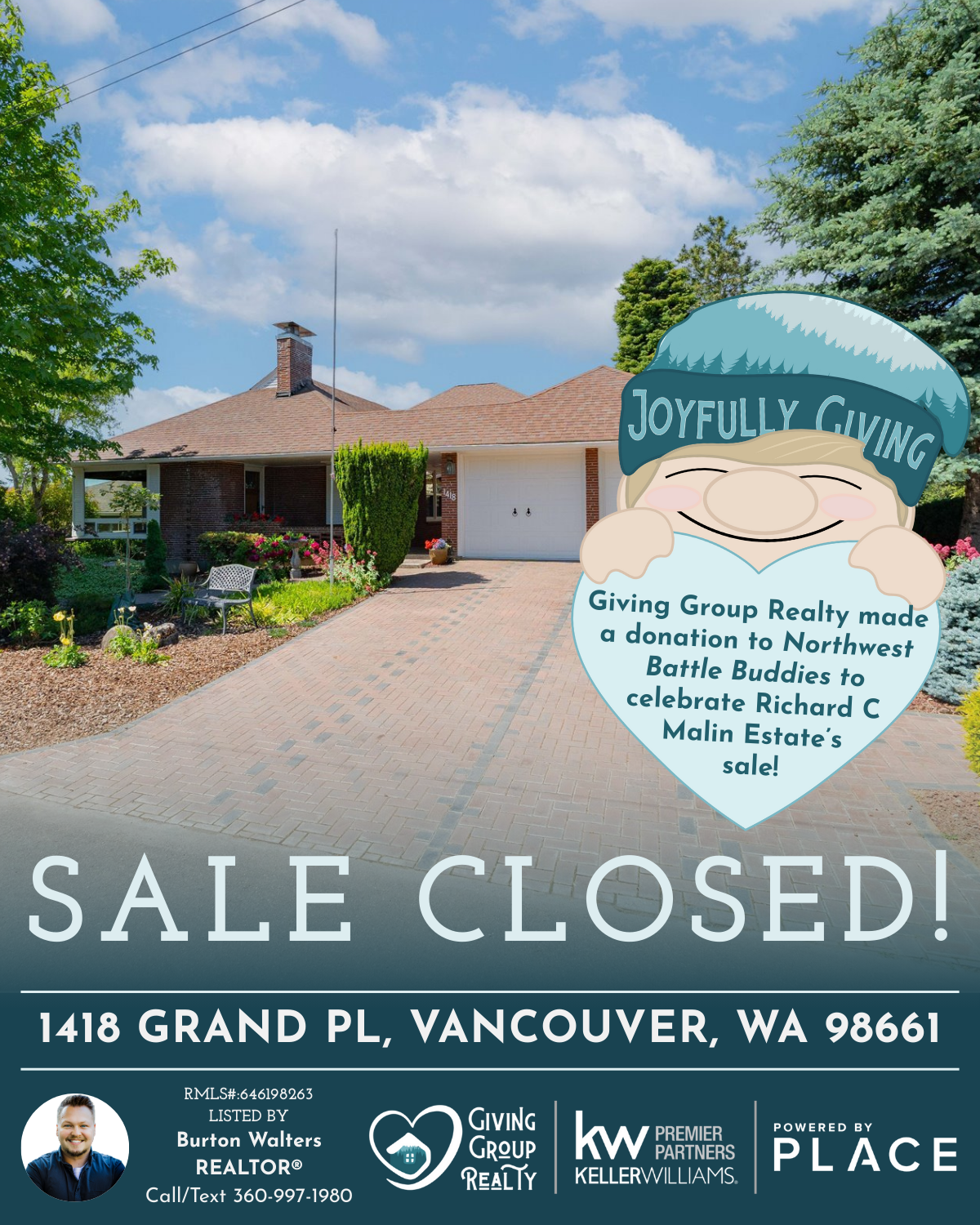Congrats, sellers! We made a donation to Northwest Battle Buddies to celebrate the sale of the Richard C Malin Estate.