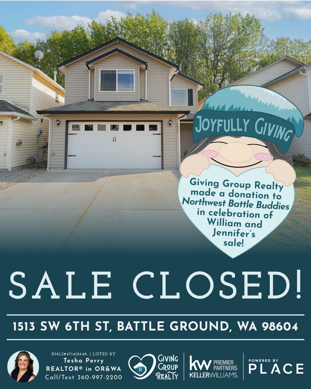 Congrats, William and Jennifer! We made a donation to Northwest Battle Buddies to celebrate your sale.