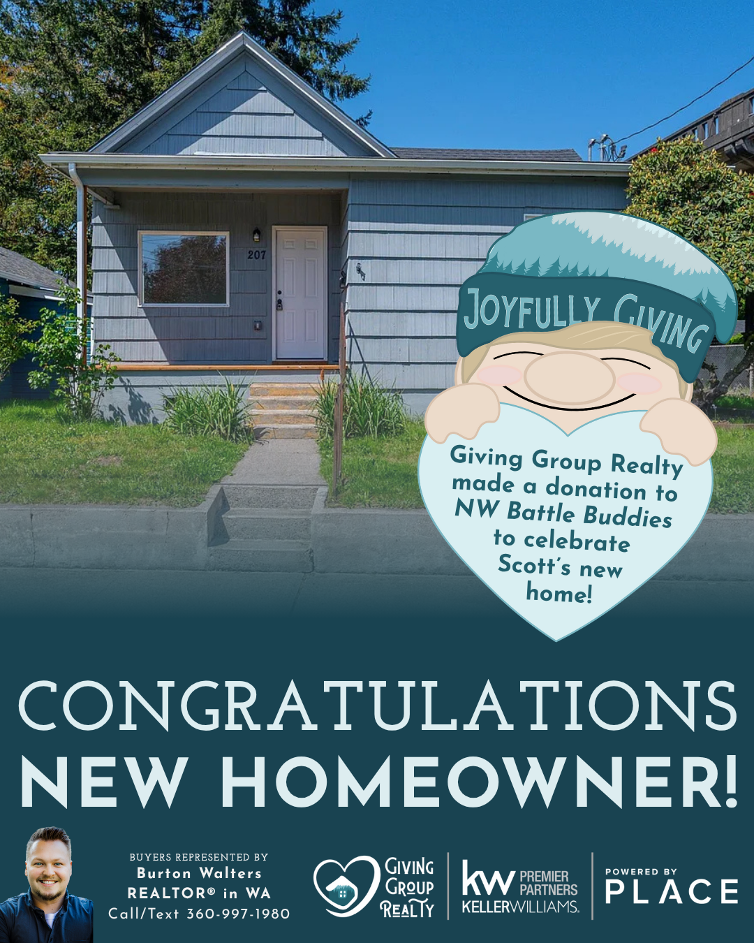 Congratulations, Scott! We made a donation to Northwest Battle Buddies in celebration of your home purchase.